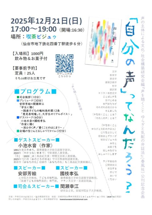「声のつながり研究会」(声の主体による文化・社会構築研究会)提供のラジオ番組「声のつながり大学」(仙台コミュニティFMラジオ3)第7回放送のおしらせです。
